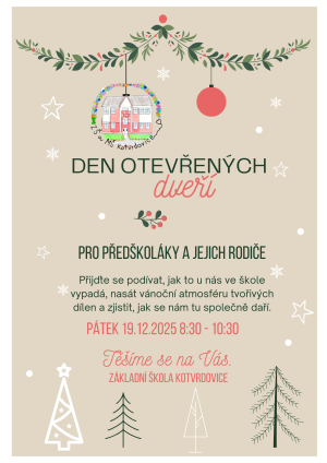 Srdečně zveme všechny předškoláky a jejich rodiče na Den otevřených dveří, který se uskuteční v pátek 19.12.2025 v rámci vánočních dílniček a zpívání koled v naší škole.